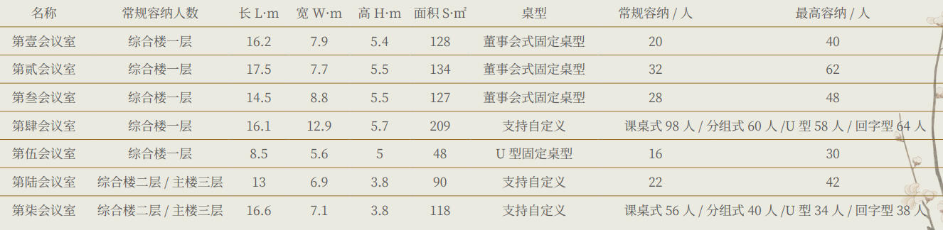 第柒会议室 综合楼二层 / 主楼三层 16.6 7.1 3.8 118 支持自定义 课桌式 56 人 / 分组式 40 人 /U 型 34 人 / 回字型 38 人